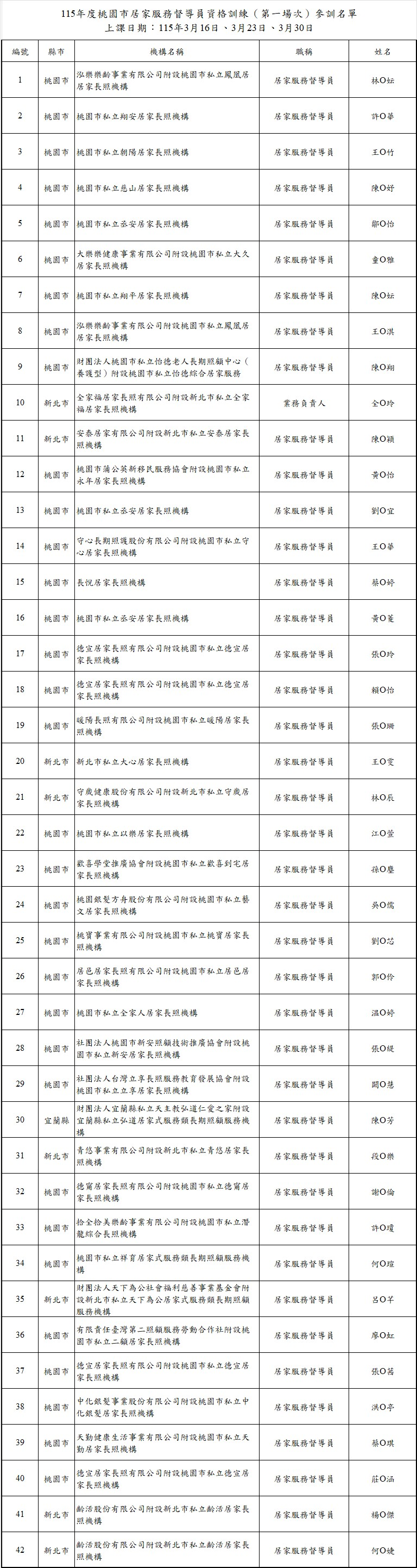 桃園市政府社會局委託辦理「115年度桃園市居家服務督導員資格訓練課程」第一場次參訓名單
